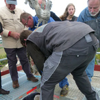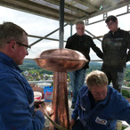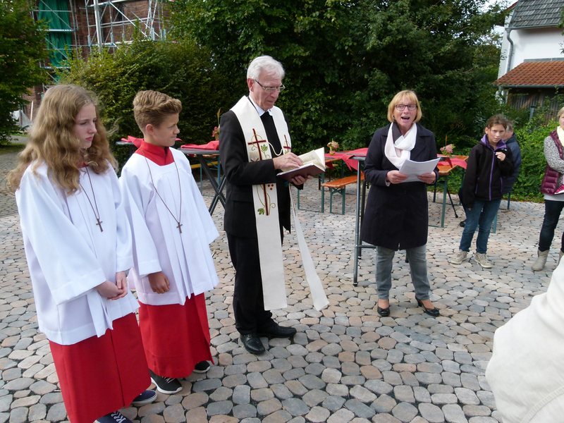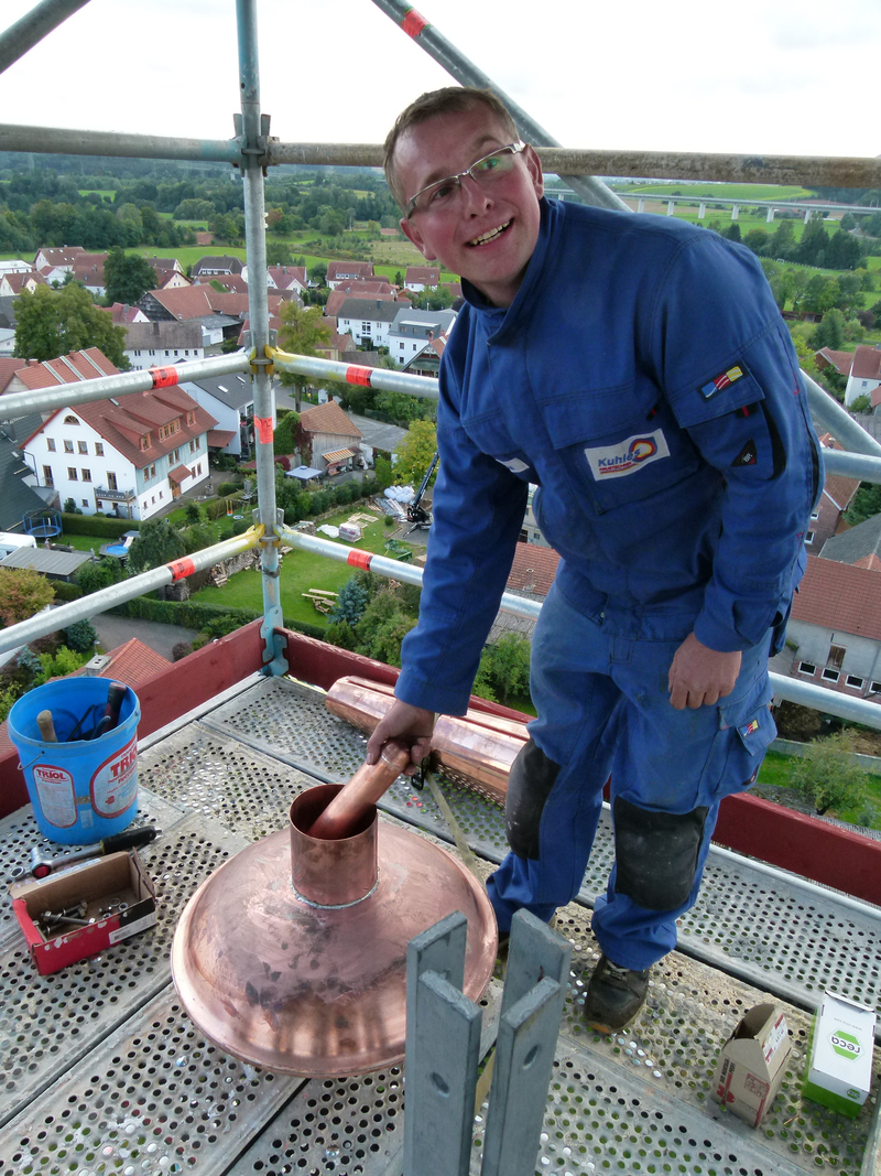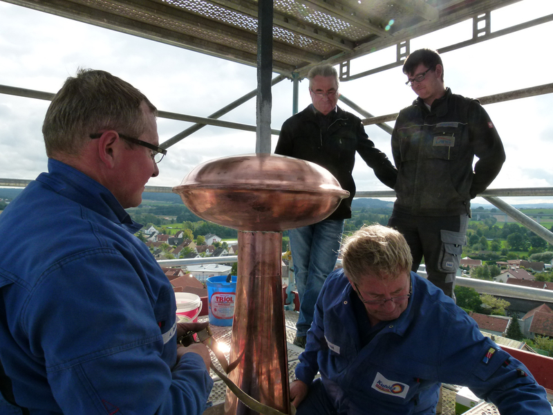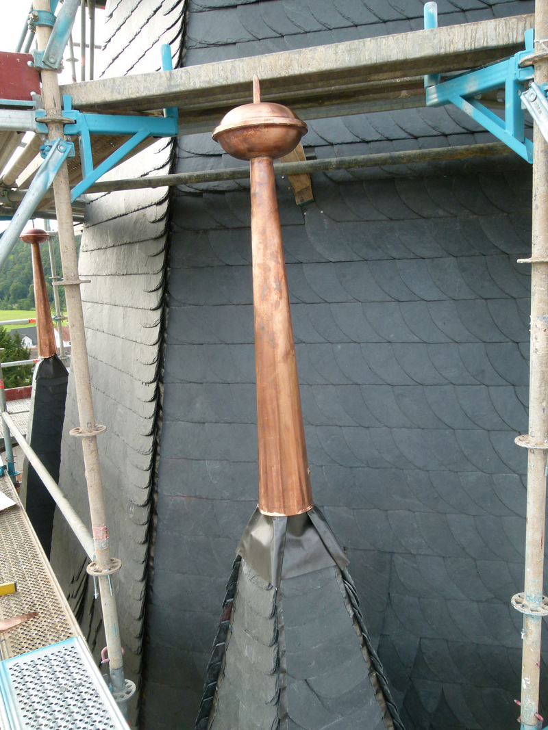 Zum heutigen Zeitpunkt ( 23. September 2015) waren die Zimmerarbeiten am Turm zu 85% abgeschlossen. Etliche Balken im Bereich der Turmkonstruktion wurden komplett erneuert, teilweise reichte es aus, Schäden auszubessern. Was im Bereich der Zimmerarbeiten zum gegenwärtigen Zeitpunkt noch anstand, waren die neuen Schall-Luken für die Glocken, die bereits gefertigt waren jedoch noch nicht eingesetzt werden mussten. Die Schieferarbeiten am Turm bis zum Uhrenbereich waren ebenfalls nahezu fertiggestellt. Der untere Teil und die Apsis werden in Angriff genommen, wenn das Gerüst abgebaut ist.